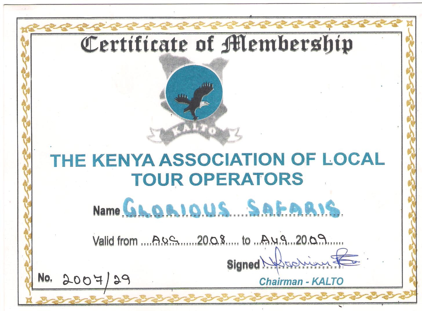 Glorious Safaris is a company with experience, having been in the Kenya tour business for over 7 Years., and is a member of KALTO (Kenya Association of Local Tour Operators) - see membership certificate.